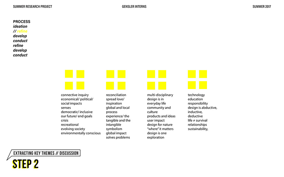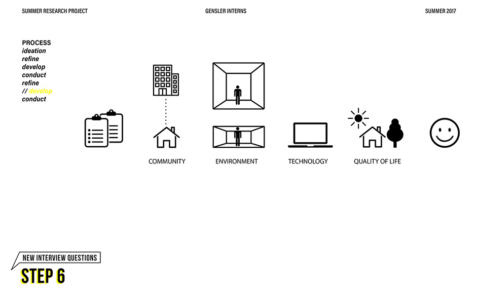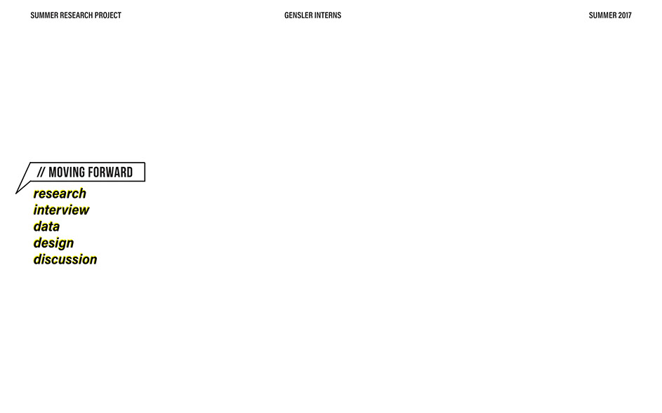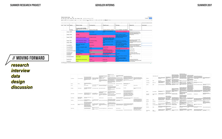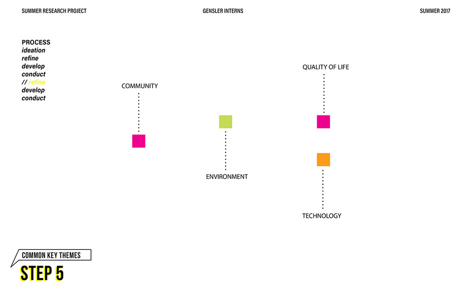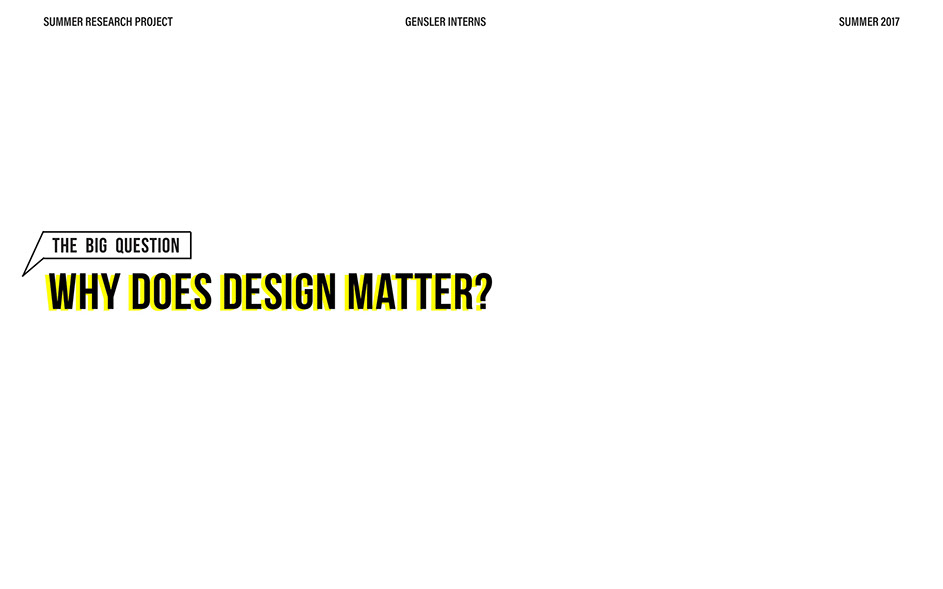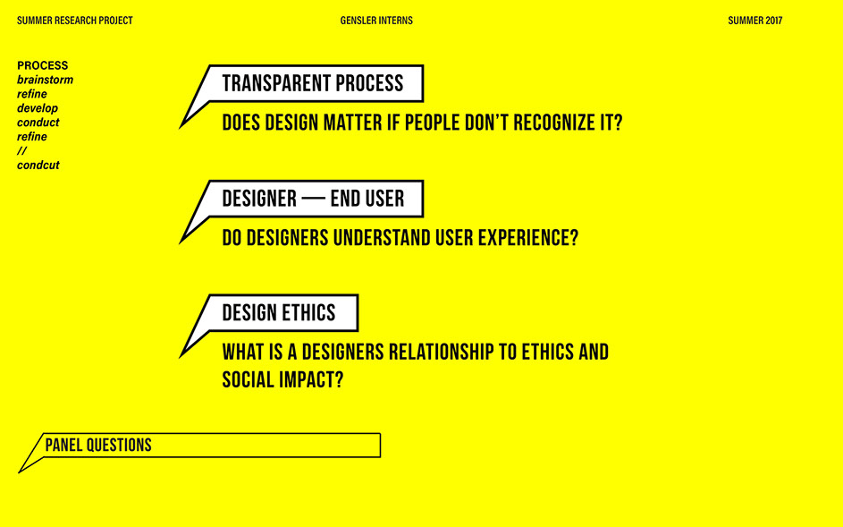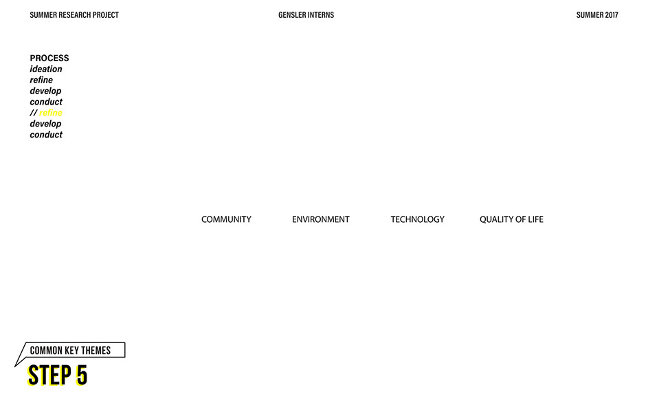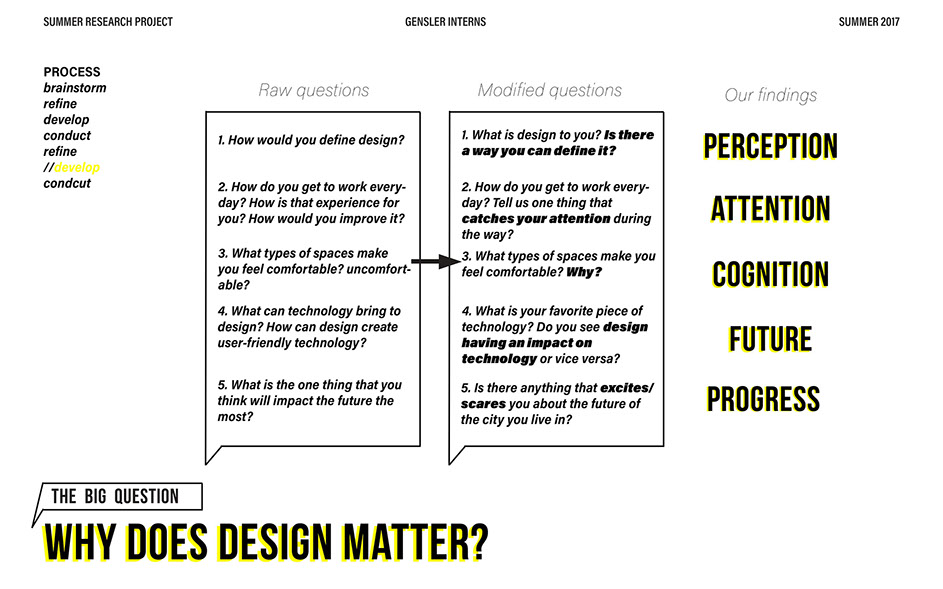What is our method? To understand the purpose of design in the changing world from both the producer’s and consumer’s perspective, the process encompassed three repeating steps: refine, develop, and conduct. First, conversation among the researchers was conducted in order to answer the question “why does design matter”, coming to a realization that the answers derived from this exercise was incoherent and needed much refinement. Consequently, the following four questions were developed to further understand the question: "How will design impact our future? When has design failed you? Where is design most effective? What is a designer’s responsibility?" By asking these questions to fellow co-workers within Gensler, engaging conversations allowed us to identify of how producers understand design and the common themes that appeared throughout. With common themes identified, data was refined, resulting in a conclusion that there are four overarching categories: community, environment, technology, and quality of life. To understand these categories better, we transposed them into six general questions: How would you define design? How do you get to work everyday? What types of spaces do you feel most comfortable/ uncomfortable in? What can technology bring to design? What is one thing that improve your quality of life? What makes a good experience? With these questions, a series of public interviews was conducted to understand design from the perspective of the consumers. Individuals of various professions and cultural backgrounds were surveyed, with varying opinions of design and why it matters. Further data were also collected and analyzed through panel discussions within the Gensler community, which uncovered three common themes that affect the impact of design: Transparency of the design process Designer and end-user relationship Design ethics In hindsight, the cyclical processing of questioning and gathering data allowed for a more comprehensive set of data critical to arriving at the conclusion of this phase of the research.