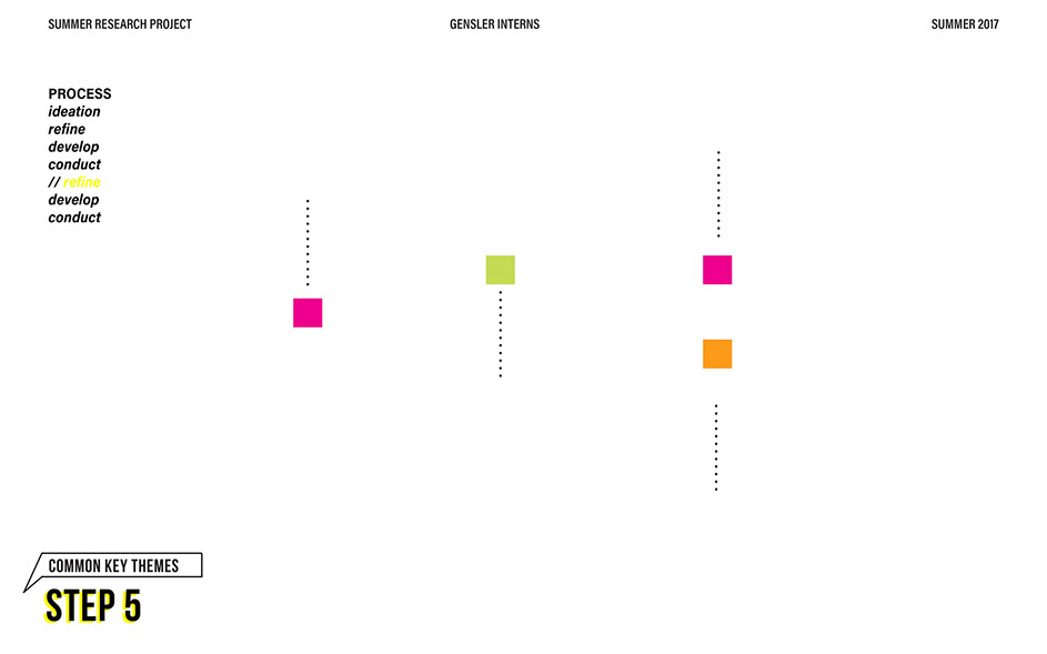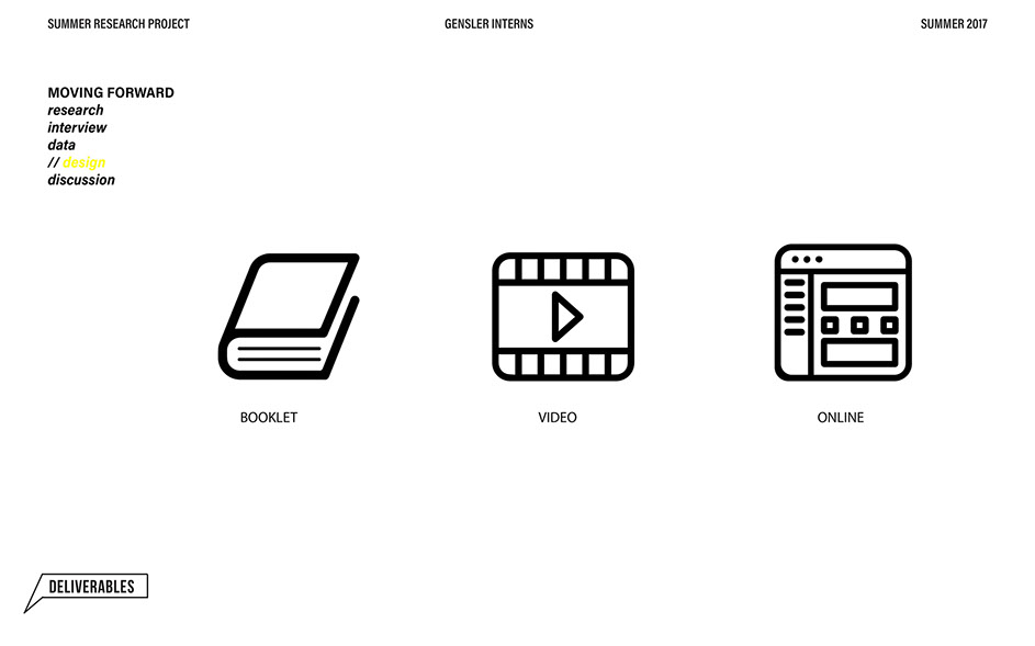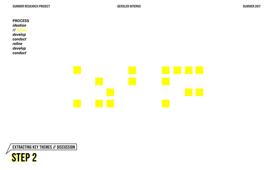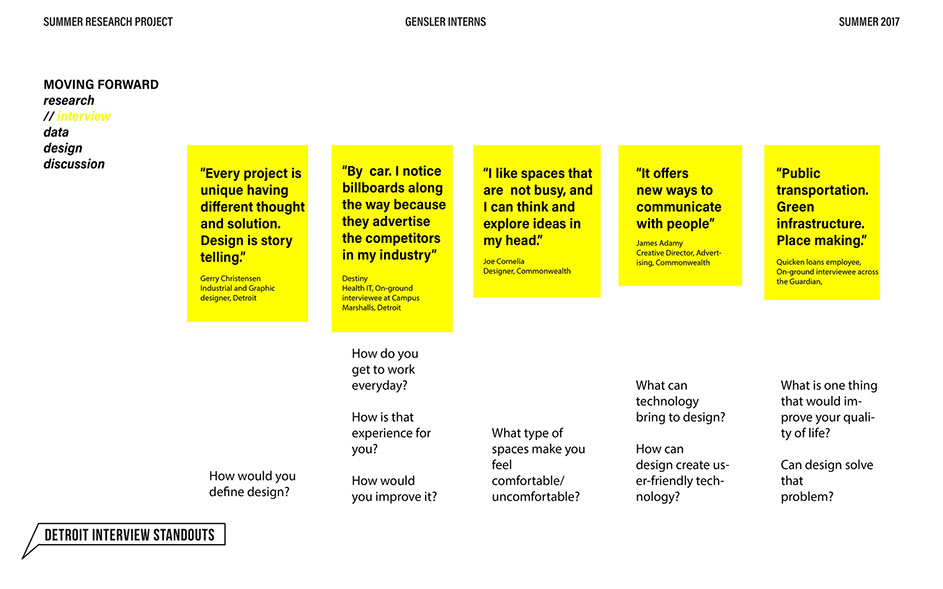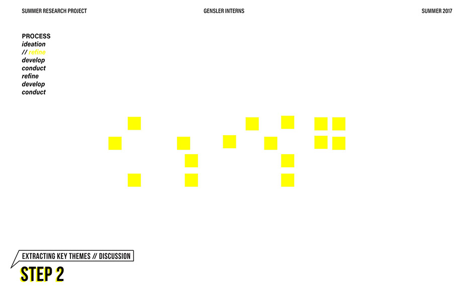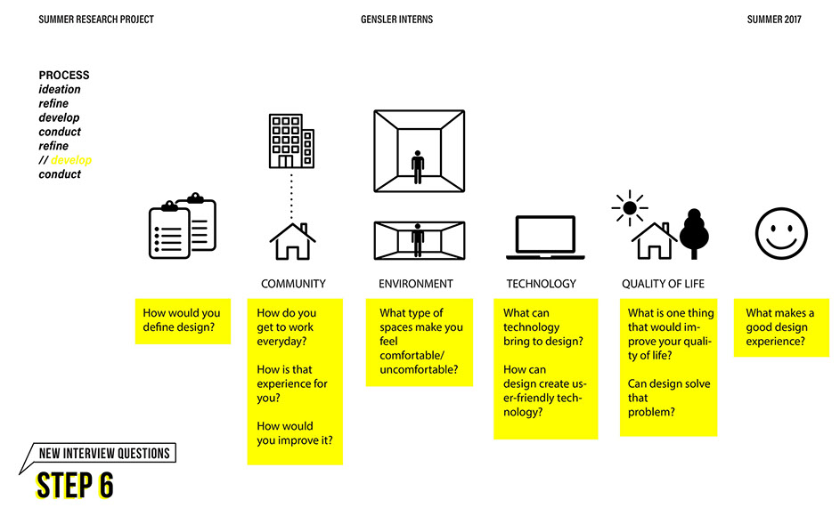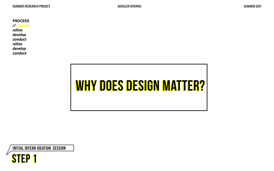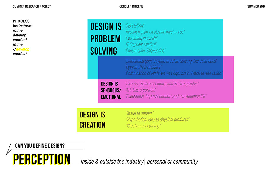 What is our method? To understand the purpose of design in the changing world from both the producer’s and consumer’s perspective, the process encompassed three repeating steps: refine, develop, and conduct. First, conversation among the researchers was conducted in order to answer the question “why does design matter”, coming to a realization that the answers derived from this exercise was incoherent and needed much refinement. Consequently, the following four questions were developed to further understand the question: "How will design impact our future? When has design failed you? Where is design most effective? What is a designer’s responsibility?" By asking these questions to fellow co-workers within Gensler, engaging conversations allowed us to identify of how producers understand design and the common themes that appeared throughout. With common themes identified, data was refined, resulting in a conclusion that there are four overarching categories: community, environment, technology, and quality of life. To understand these categories better, we transposed them into six general questions: How would you define design? How do you get to work everyday? What types of spaces do you feel most comfortable/ uncomfortable in? What can technology bring to design? What is one thing that improve your quality of life? What makes a good experience? With these questions, a series of public interviews was conducted to understand design from the perspective of the consumers. Individuals of various professions and cultural backgrounds were surveyed, with varying opinions of design and why it matters. Further data were also collected and analyzed through panel discussions within the Gensler community, which uncovered three common themes that affect the impact of design: Transparency of the design process Designer and end-user relationship Design ethics In hindsight, the cyclical processing of questioning and gathering data allowed for a more comprehensive set of data critical to arriving at the conclusion of this phase of the research.