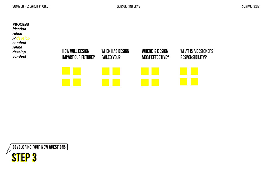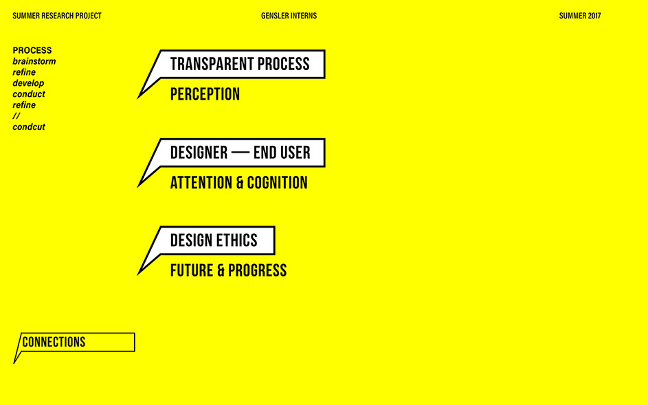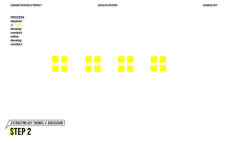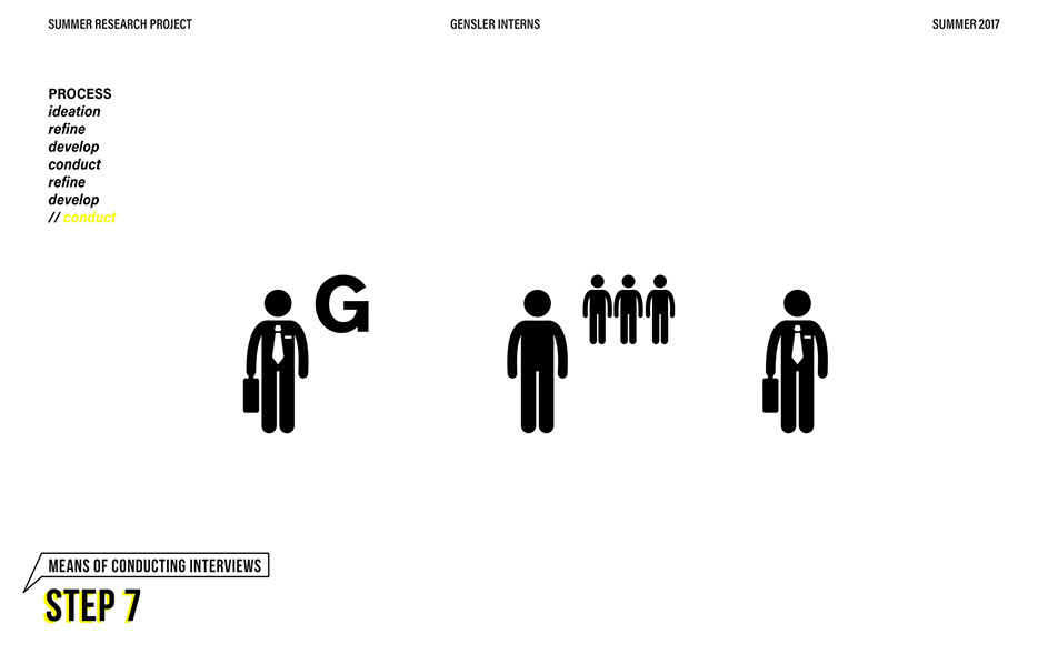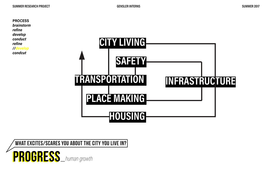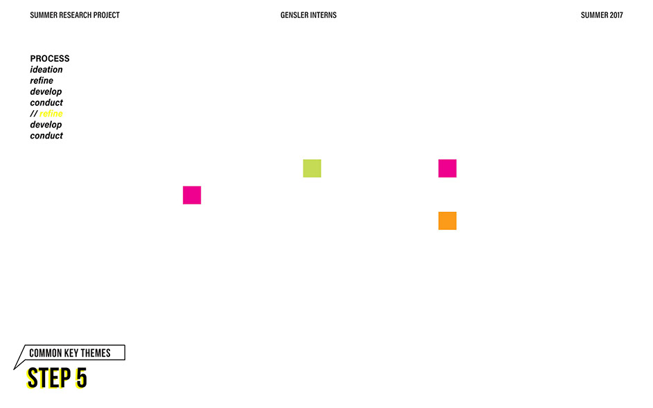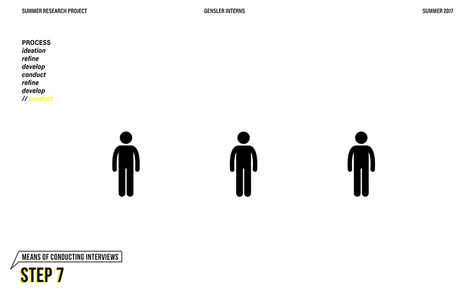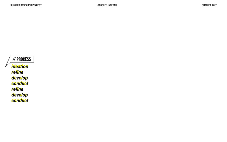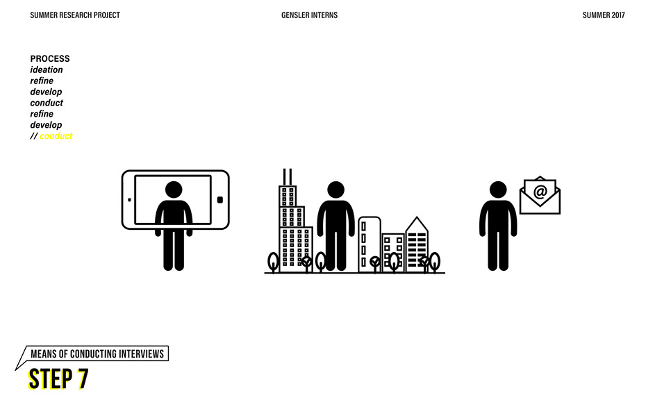 What is our method? To understand the purpose of design in the changing world from both the producer’s and consumer’s perspective, the process encompassed three repeating steps: refine, develop, and conduct. First, conversation among the researchers was conducted in order to answer the question “why does design matter”, coming to a realization that the answers derived from this exercise was incoherent and needed much refinement. Consequently, the following four questions were developed to further understand the question: "How will design impact our future? When has design failed you? Where is design most effective? What is a designer’s responsibility?" By asking these questions to fellow co-workers within Gensler, engaging conversations allowed us to identify of how producers understand design and the common themes that appeared throughout. With common themes identified, data was refined, resulting in a conclusion that there are four overarching categories: community, environment, technology, and quality of life. To understand these categories better, we transposed them into six general questions: How would you define design? How do you get to work everyday? What types of spaces do you feel most comfortable/ uncomfortable in? What can technology bring to design? What is one thing that improve your quality of life? What makes a good experience? With these questions, a series of public interviews was conducted to understand design from the perspective of the consumers. Individuals of various professions and cultural backgrounds were surveyed, with varying opinions of design and why it matters. Further data were also collected and analyzed through panel discussions within the Gensler community, which uncovered three common themes that affect the impact of design: Transparency of the design process Designer and end-user relationship Design ethics In hindsight, the cyclical processing of questioning and gathering data allowed for a more comprehensive set of data critical to arriving at the conclusion of this phase of the research.