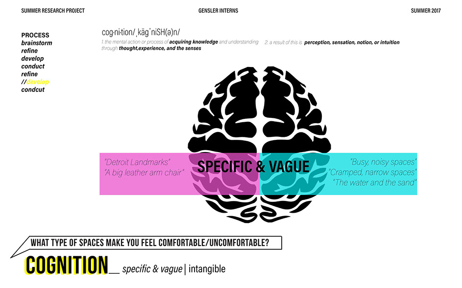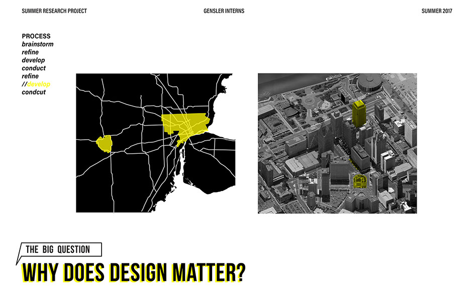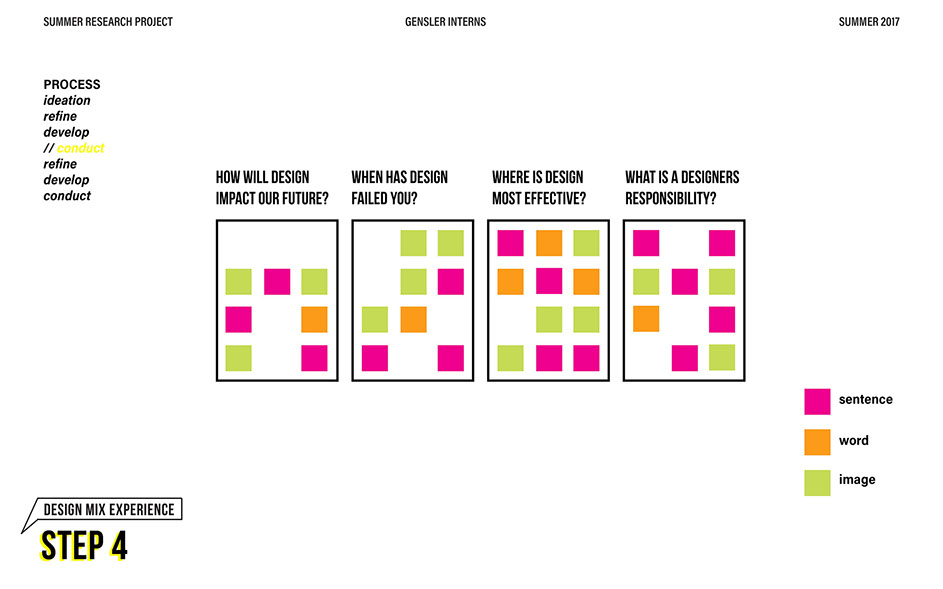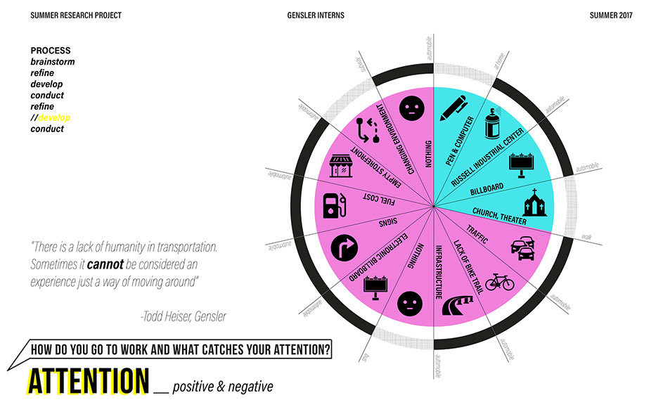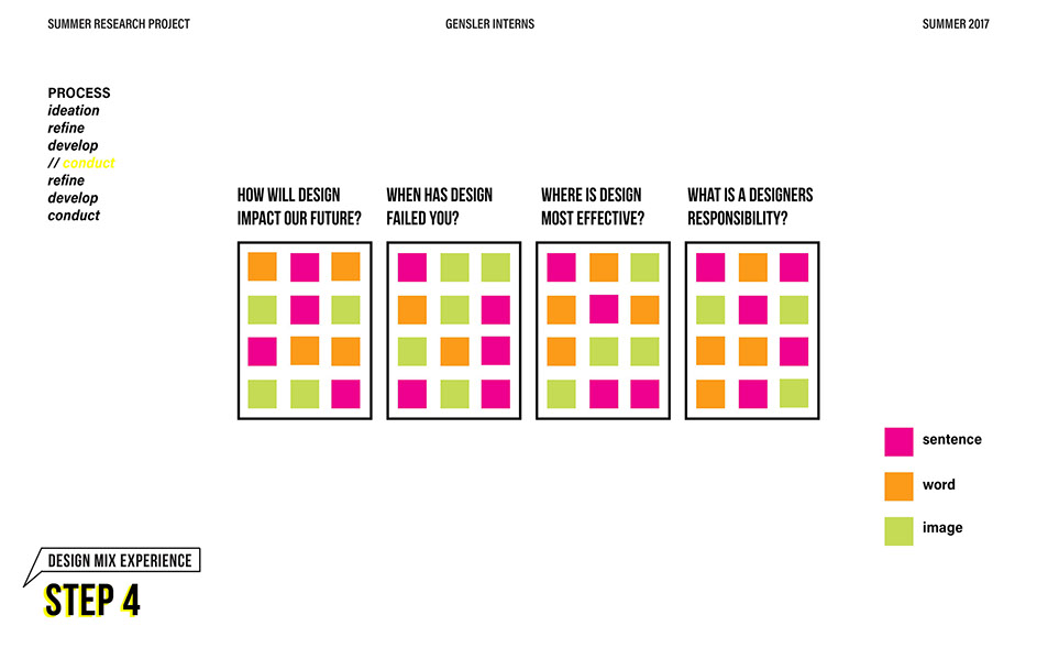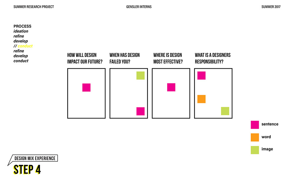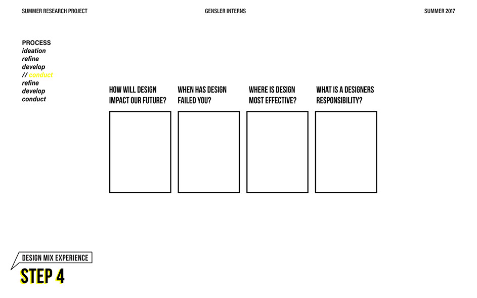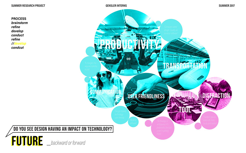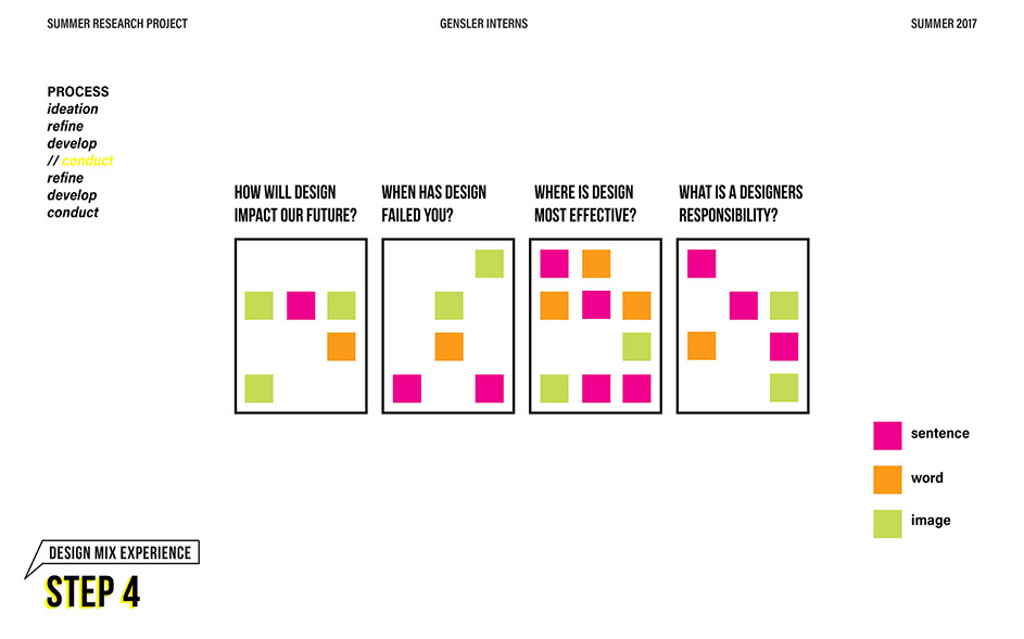 What is our method? To understand the purpose of design in the changing world from both the producer’s and consumer’s perspective, the process encompassed three repeating steps: refine, develop, and conduct. First, conversation among the researchers was conducted in order to answer the question “why does design matter”, coming to a realization that the answers derived from this exercise was incoherent and needed much refinement. Consequently, the following four questions were developed to further understand the question: "How will design impact our future? When has design failed you? Where is design most effective? What is a designer’s responsibility?" By asking these questions to fellow co-workers within Gensler, engaging conversations allowed us to identify of how producers understand design and the common themes that appeared throughout. With common themes identified, data was refined, resulting in a conclusion that there are four overarching categories: community, environment, technology, and quality of life. To understand these categories better, we transposed them into six general questions: How would you define design? How do you get to work everyday? What types of spaces do you feel most comfortable/ uncomfortable in? What can technology bring to design? What is one thing that improve your quality of life? What makes a good experience? With these questions, a series of public interviews was conducted to understand design from the perspective of the consumers. Individuals of various professions and cultural backgrounds were surveyed, with varying opinions of design and why it matters. Further data were also collected and analyzed through panel discussions within the Gensler community, which uncovered three common themes that affect the impact of design: Transparency of the design process Designer and end-user relationship Design ethics In hindsight, the cyclical processing of questioning and gathering data allowed for a more comprehensive set of data critical to arriving at the conclusion of this phase of the research.